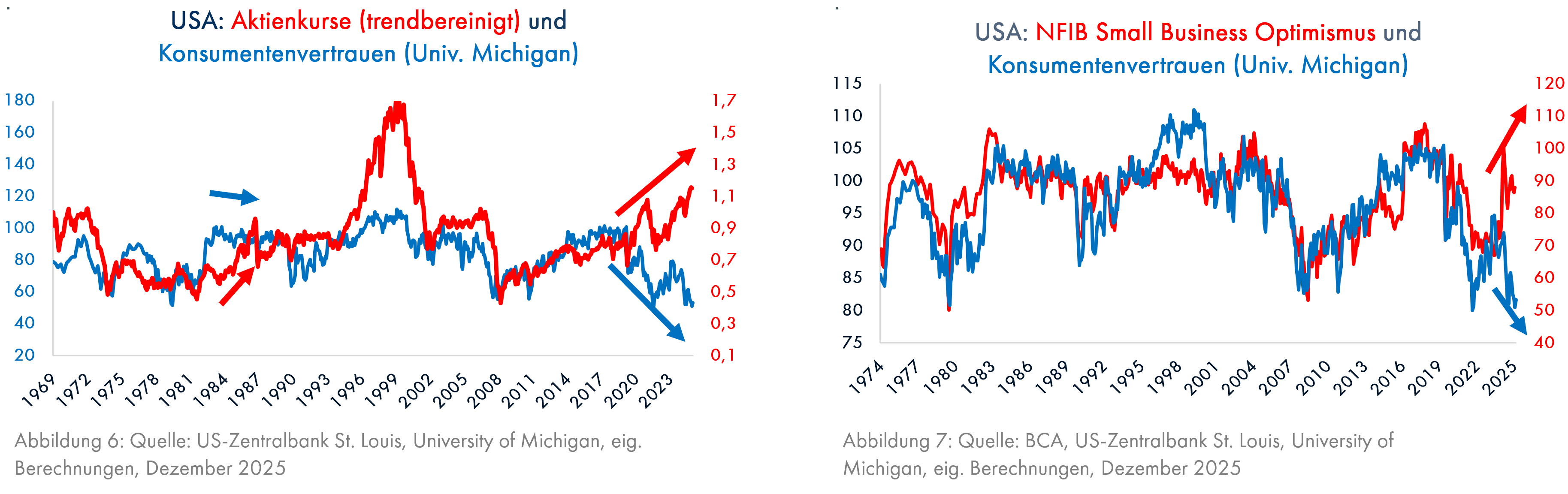 Das entspräche fast einem Drittel des aktuellen Wirtschaftswachstums, an der Wall Street neuerdings „ChatGDP“ genannt, weil fast die Hälfte des aktuell bei 3% liegenden Wachstums aus dem Konsum der Aktienbesitzer stammt, die ihre Kursgewinne mit KI-Aktien feiern (knapp 80% der Kursgewinne des US-Aktienmarktes stammten bis November aus KI-Aktien, Quelle: ntv vom 13.11.2025). Diese Faustregel stammt allerdings aus Zeiten, als die Aktien der Amerikaner allenfalls das Doppelte des verfügbaren Einkommens ausmachten und nicht das Dreifache (Grafik 8), daher dürften sich künftige Kursverluste am Aktienmarkt stärker auf den Konsum auswirken. Die andere Hälfte des Wachstums entstand aus dem starken Zuwachs der Investitionen in Rechenzentren für das Training und das Betreiben von KI-Programmen wie z.B. ChatGPT. Der Durchschnittsamerikaner hat nicht viel zu feiern (siehe das Konsumentenvertrauen in den Grafiken 6 und 7). Wenn dann auch die Party des oberen Prozentes endet, sieht es für den US-Konsum nicht gut aus, zumal bei schwindendem Vertrauen in die KI-Story (sehr lesenswert ist dazu die KI-Geschichte des manager magazins vom Dezember 2025, in der der wachsende Einsatz von Zweckgesellschaften zum Vertuschen der schnell wachsenden Schulden der KI-Unternehmen analog zur Finanzkrise 2008 beschrieben wird).