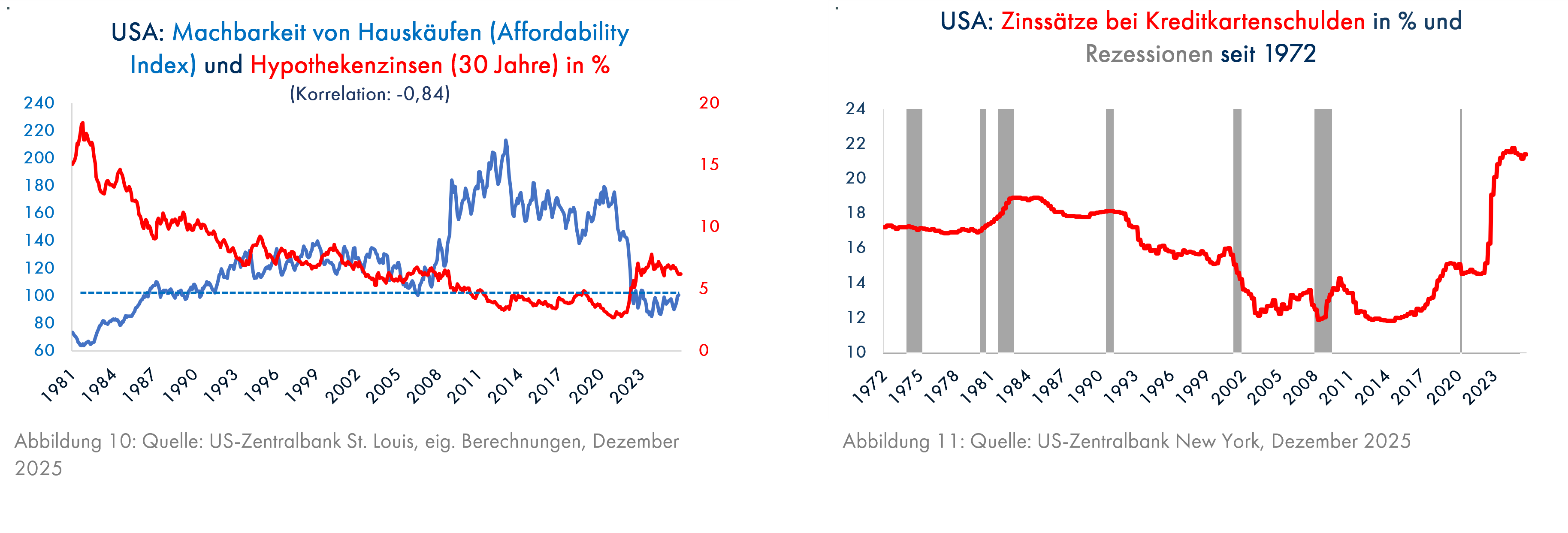 Da werden weitere Zinssenkungen der US-Zentralbank allein nicht helfen können. Seit 1960 hat die US-Zentralbank durchschnittlich 6 Monate vor Beginn einer Rezession mit Zinssenkungen gegengesteuert (Grafik 9). Immer dann, wenn die Zinssenkungen in einer Zeit fallender Leading Economic Indicators stattfanden (rote Pfeile in Grafik 9), also unter den aktuellen Bedingungen, konnte die Rezession nicht verhindert werden. Die vermutlich ab Mai 2026, wenn die reguläre Amtszeit des jetzigen Zentralbank-Präsidenten Powell endet, regierungshörige US-Zentralbank wird neben den kurzfristigen auch die langfristigen Zinsen senken müssen, damit der Durchschnittsamerikaner wieder Häuser kaufen und konsumieren kann. Die Hypothekenzinsen sehen nicht besonders hoch aus (Grafik 10), aber die Machbarkeit von Hauskäufen, die auch von den Hauspreisen und der Einkommensentwicklung abhängt, ist immer noch sehr niedrig und trägt zur Frustration der Amerikaner bei. Für die Bezieher niedriger Einkommen sind die Zinsen der Kreditkartenschulden wichtig (Grafik 11). Diese liegen jedoch auf einem extrem hohen Niveau, das selbst während der Hochzinsphase um 1980 (siehe Grafik 10) nicht erreicht wurde. Die aktuellen Diskussionen über KI kommen für Trump zur Unzeit, der im Herbst 2026 die Zwischenwahlen gewinnen muss, um einer erheblichen Machteinbuße zu entgehen; beim Thema KI darf daher nichts schiefgehen. Die langfristigen US-Zinsen müssen sinken.