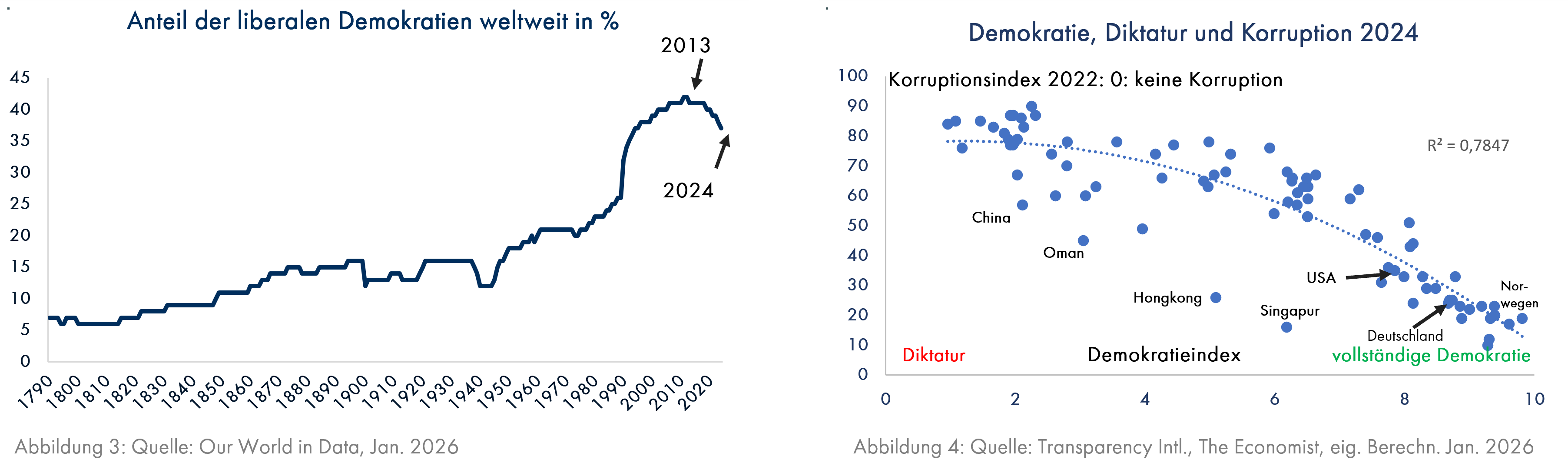 Der erste Grund für unsere weiterhin vorsichtige Haltung zu US-Vermögenswerten ist das geopolitische Umfeld. Dieses hat in den letzten Wochen eine neue, aber nicht überraschende und nicht unbedingt negative Wende genommen. Die Diktatoren gehen sich jetzt gegenseitig an die Gurgel. Trump hat seinen venezolanischen Amtskollegen Maduro „abgesetzt“. Der ukrainische Präsident Selenski regte folgerichtig an, Putin genauso zu behandeln, ohne dessen Namen zu nennen: „Wenn es möglich ist, so mit Diktatoren umzugehen, dann wissen die USA, was als Nächstes zu tun ist.“ Die Bemerkung wurde weithin als indirekter Hinweis auf den russischen Präsidenten Wladimir Putin verstanden (Quelle: dagens.de vom 5.1.2026), zumal Trumps vormals innige Zuneigung zu seinem russischen Kollegen Putin bröckelt und außerdem von einem wachsenden Teil seiner Partei nicht mehr geteilt wird. Auch die romantische Liebe Putins zu Xi Jinping wird nicht ewig halten. „Nationalistische (chinesische) Kommentatoren fordern China auf, im Falle eines politischen und wirtschaftlichen Zusammenbruchs Russlands bis zu ein Drittel des russischen Territoriums in den Blick zu nehmen. Im Fokus steht der russische Ferne Osten, eine Region mit einer Fläche von rund 7 Millionen Quadratkilometern. Sie verfügt über bedeutende Mineral- und Energieressourcen, darunter Gold, Diamanten und Öl, hat jedoch nur etwa acht Millionen Einwohner …“ (Zitat: dagens.de vom 5. 1. 2026; mehr Details finden sie hier: Diese 8 Gebiete will China Russland wieder abnehmen | Der Pragmaticus). Interessant sind auch die plötzlichen Erkenntnisse der europäischen Trump-Anhänger, wie z.B. des rechtspopulistischen britischen Politikers Nigel Farage, der maßgeblich am für England schädlichen Brexit mitgewirkt hat, oder Jordan Bardella, Chef der französischen Rechtsradikalen. Sie müssen plötzlich erkennen, dass machtgierige, nationalistische und innen- wie außenpolitisch gewaltbereite Diktatoren wie Trump ausschließlich ihrer persönlichen Interessen und die ihrer Oligarchen verfolgen, aber ganz bestimmt nicht die Interessen ausländischer Politiker, auch wenn sie bisher mit Trump sympathisiert hatten. Seit Trumps Griff nach Grönland herrscht in der Diktatoren- und Populisten-Szene Verunsicherung. Man sieht sich gezwungen, Trump zu kritisieren, um nicht des Landesverrats bezichtigt zu werden.