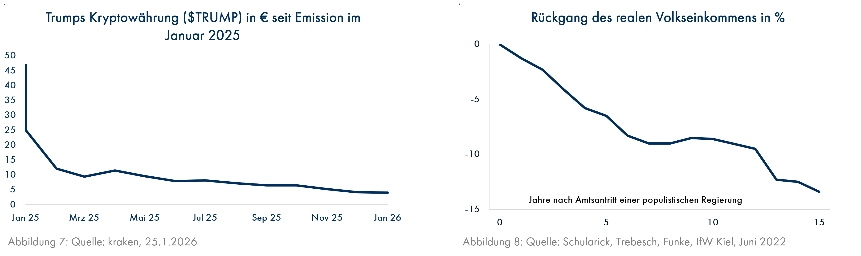Für seine weniger gut betuchten Anhänger hat sich Trump neben Kürzungen von Sozialleistungen, die z.T. erst nach den Zwischenwahlen im Herbst 2026 wirksam werden (Quelle: Heinrich-Böll-Stiftung, 18.7.2025), und den Übergriffen der staatlichen Schlägertruppe ICE etwas absolut Neues ausgedacht. Wenige Tage vor seiner Amtseinführung zog er seinen Anhängern mit einer selbstgebastelten Kryptowährung ($TRUMP) viele Millionen Dollar aus der Tasche. Der Kursverlauf zeigt, dass außer ihm und seinen Kumpels kaum jemand damit Geld verdient haben dürfte (Grafik 7). Die Bevölkerung von populistisch regierten Staaten hat ohnehin nicht viel zu lachen, wie eine Analyse des Instituts für Weltwirtschaft in Kiel gezeigt hat. Die Studie von Prof. Moritz Schularick et al. vom Juni 2022 ergibt aufgrund einer Analyse der wirtschaftlichen Entwicklung von 60 Ländern seit 1915, dass populistische Regierungen die Wirtschaft der von ihnen regierten Länder erheblich beschädigen (Grafik 8).