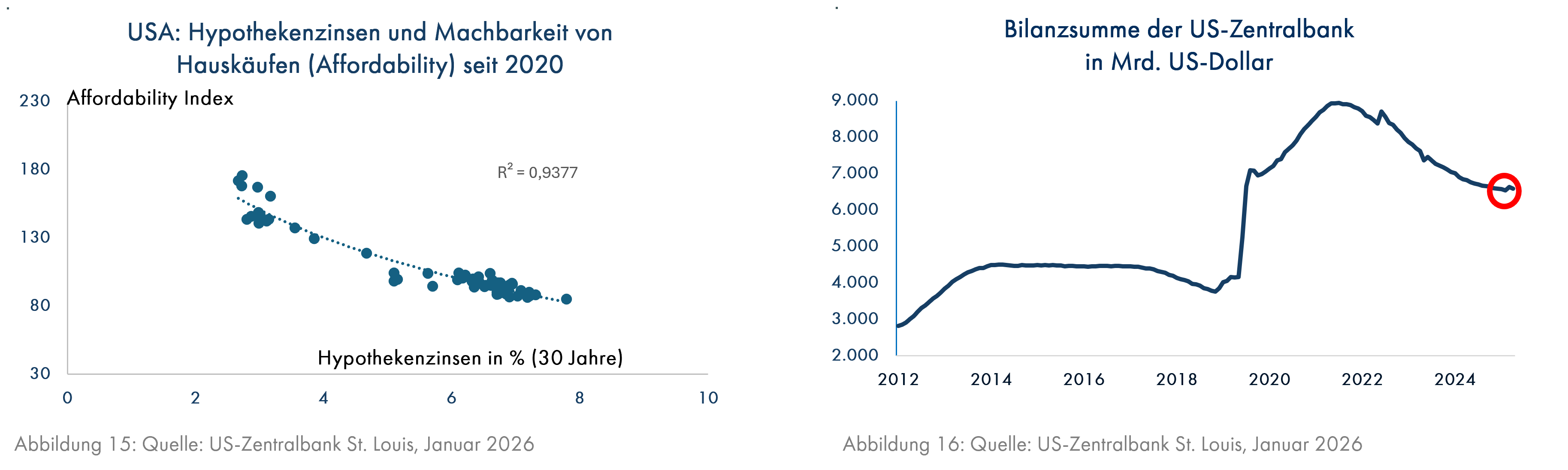 Wenn Trump, der unternehmerfreundliche Präsident, die Banken zwingt, das Kreditangebot nicht einzuschränken, wirkt die Zinssenkung natürlich vorübergehend stimulierend, aber auch inflationstreibend und schwächt das Vertrauen in die Verlässlichkeit des US-Finanzsystems. Eine weitere neue Maßnahme ist das künstliche Absenken der Zinsen für langfristige Hypothekendarlehen. Trump kündigte auf seinem Propagandakanal „Truth Social“ einen massiven Ankauf von Hypothekenanleihen im Volumen von anfänglich 200 Mrd. US-Dollar an, um damit Immobilienkredite günstiger zu machen (Quelle: Wirtschaftswoche, 9.1.2026). Da die Wohnimmobilienpreise in den USA (Grafik 12) jedoch trotz des Anstiegs der Hypothekenzinsen ab 2021 (rote Linie in Grafik 13) auf historische Höchststände gestiegen sind, ist die Machbarkeit von Hauskäufen sehr niedrig (blaue Linie in Grafik 13). Dies wiederum ist eine wichtige Ursache für die schlechte Stimmung der Konsumenten in den USA (Grafik 14). Eine Senkung der langfristigen Hypothekenzinsen würde die Machbarkeit von Hauskäufen sofort verbessern (Grafik 15).