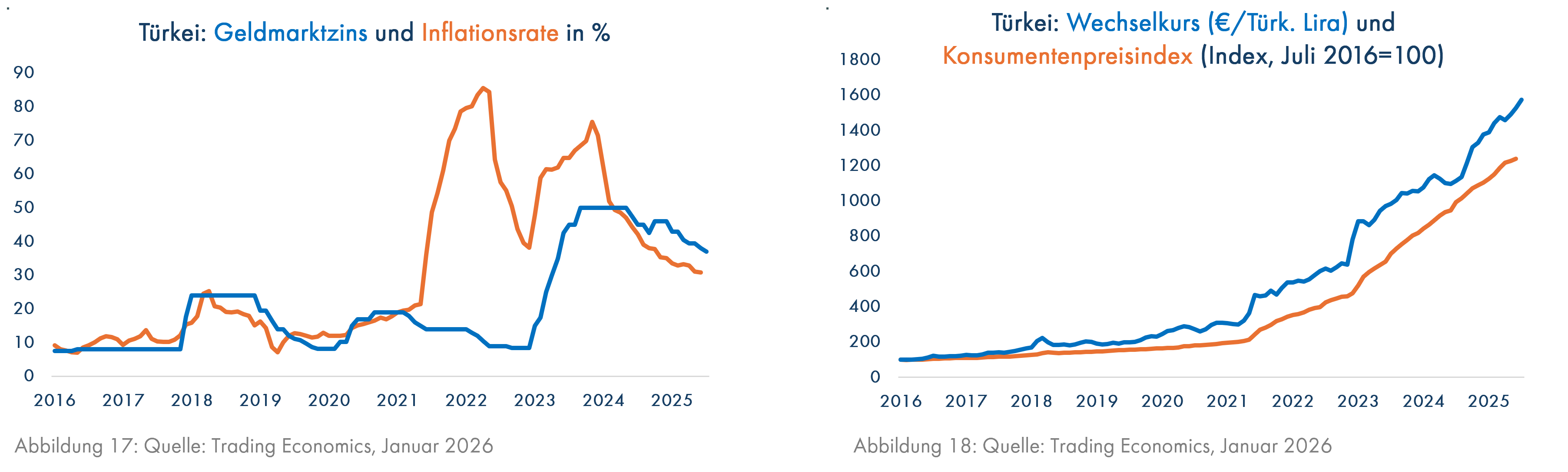Nur ein niedriger Zins am kurzen und am langen Ende kann den Konsum der breiten Masse, die bisher wenig vom KI-Boom profitiert hat, wieder anfeuern. Insbesondere ein sinkender langfristiger Zins würde die Machbarkeit von Hauskäufen sofort verbessern. Dabei darf man sich nicht von steigender Inflation aufhalten lassen, wie Trumps türkischer Kollege Erdogan gezeigt hat. Dieser war wie Trump der Meinung, besser als seine Zentralbank zu wissen, wo der Zins hingehört, nämlich nach unten. 2021 war die türkische Inflationsrate immer weiter gestiegen, als die Zentralbank, inzwischen unter dem Einfluss von Erdogan, den Zins senkte und sich davon auch nicht durch einen plötzlichen Inflationssprung auf über 80% abhalten ließ (Grafik 17). Die ab diesem Zeitpunkt mit einem extrem negativen Realzins ausgestattete türkische Währung verlor ab 2021 dramatisch an Wert. Man braucht heute fünfmal mehr Türkische Lira, um einen Euro kaufen zu können, als 2021 (Grafik 18). Natürlich ist es keine Prognose, dass der US-Dollar eine ähnliche Entwicklung nehmen wird, aber es ist eben unter Trumps Herrschaft durchaus möglich. Am 27.1.2026 brauchte man erstmals seit Juni 2021 wieder mehr als 1,20 US-Dollar, um einen Euro kaufen zu können. Der Grund war, dass Trump sich erfreut über die Schwäche des US-Dollars geäußert hatte.
