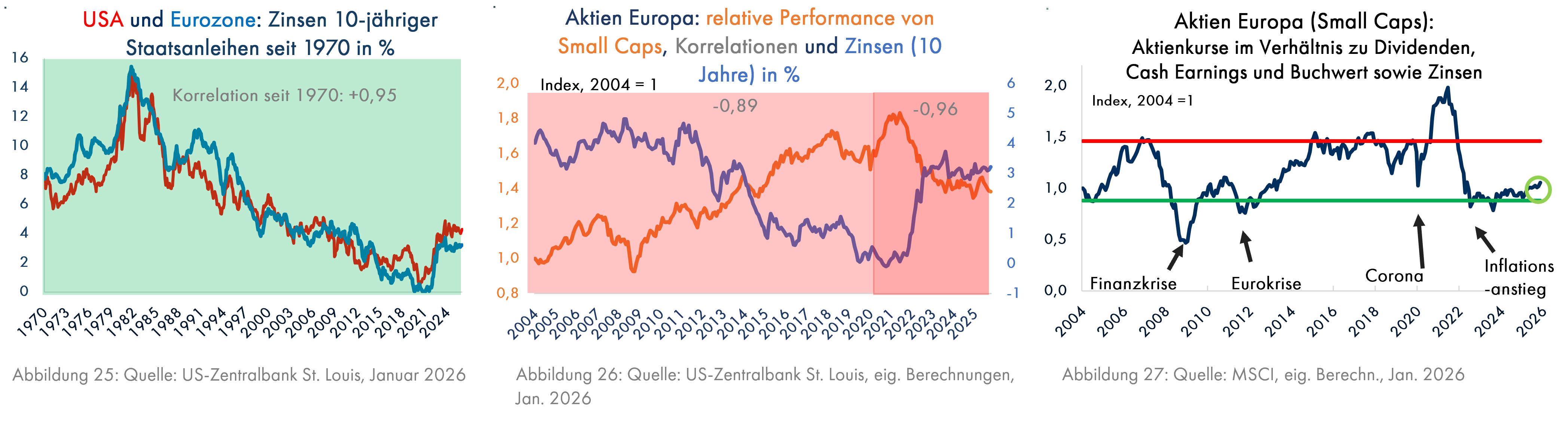 Besonders die kleineren europäischen Firmen (Small Caps) könnten sich in diesem Umfeld gut entwickeln. Trumps vielfältige, teilweise mit der Brechstange durchgeführten Bemühungen, den kurz- und langfristigen Zins in den USA herunterzudrücken, dürften zumindest kurz- und mittelfristig nicht ohne Wirkung bleiben. In Verbindung mit einem schwachen US-Dollar, der in Europa die Preise für importierte Güter und damit die Inflationsrate absenkt, dürfte auch in der Eurozone der langfristige Zins sinken. Seit 1970 gibt es einen sehr engen Zusammenhang zwischen den langfristigen Zinsen in den USA und in der Eurozone (Grafik 25); in 95 von 100 Fällen bewegten sich diese Zinsen in die gleiche Richtung. Die europäischen Small Caps hatten sich von 2004 bis 2021 besser, danach aber deutlich schlechter als die großen Standardwerte entwickelt. Der entscheidende Grund dafür war der plötzliche Anstieg der langfristigen Zinsen in der Eurozone (Grafik 26). Wenn diese Zinsen künftig stagnieren oder sogar fallen, werden die Small Caps angesichts ihrer günstigen Bewertung (Grafik 27) überdurchschnittlich hohe Renditen erwirtschaften; unsere Modelle zeigen eine jährliche Ertragserwartung im oberen einstelligen Bereich für die nächsten 10 Jahre an.