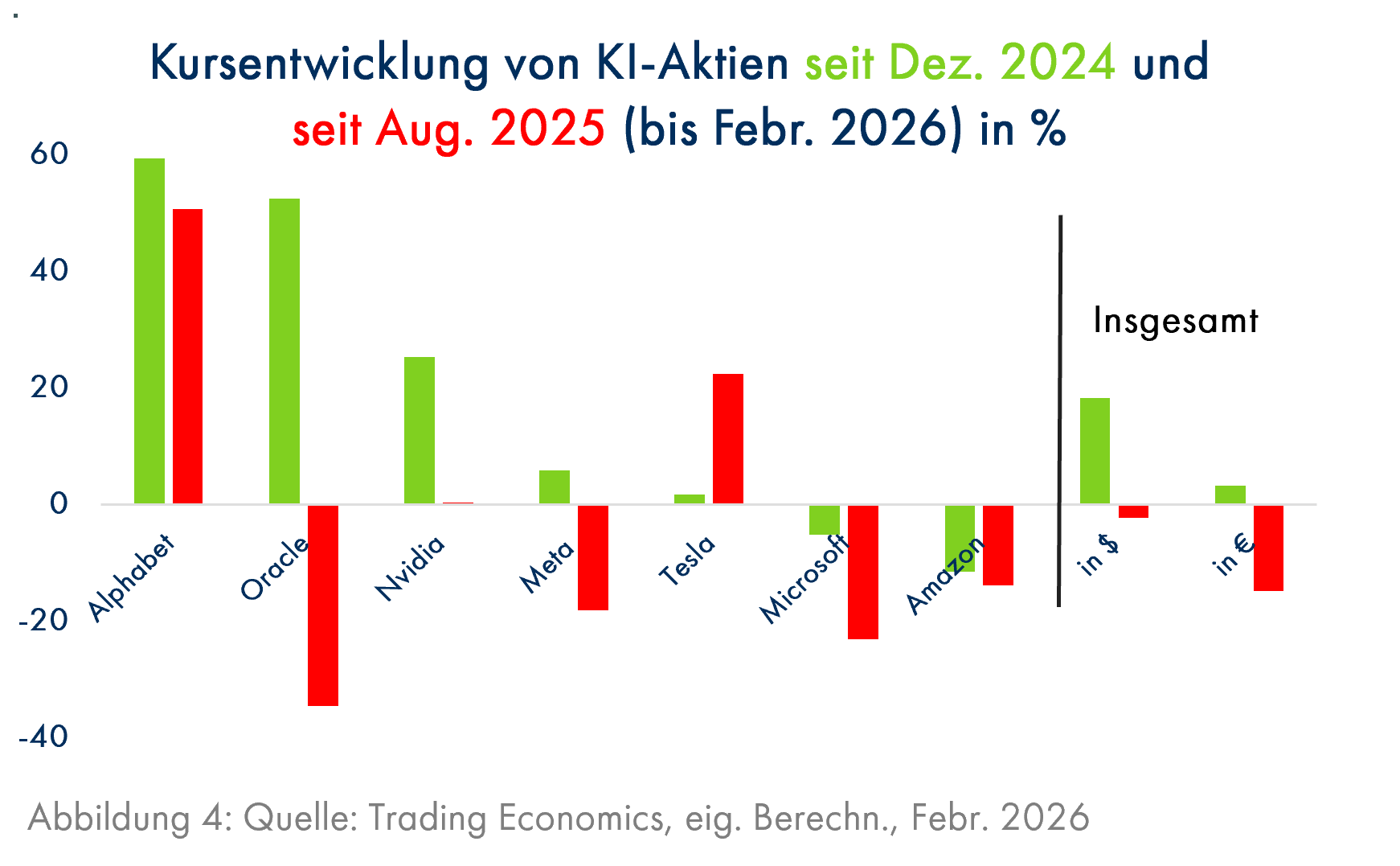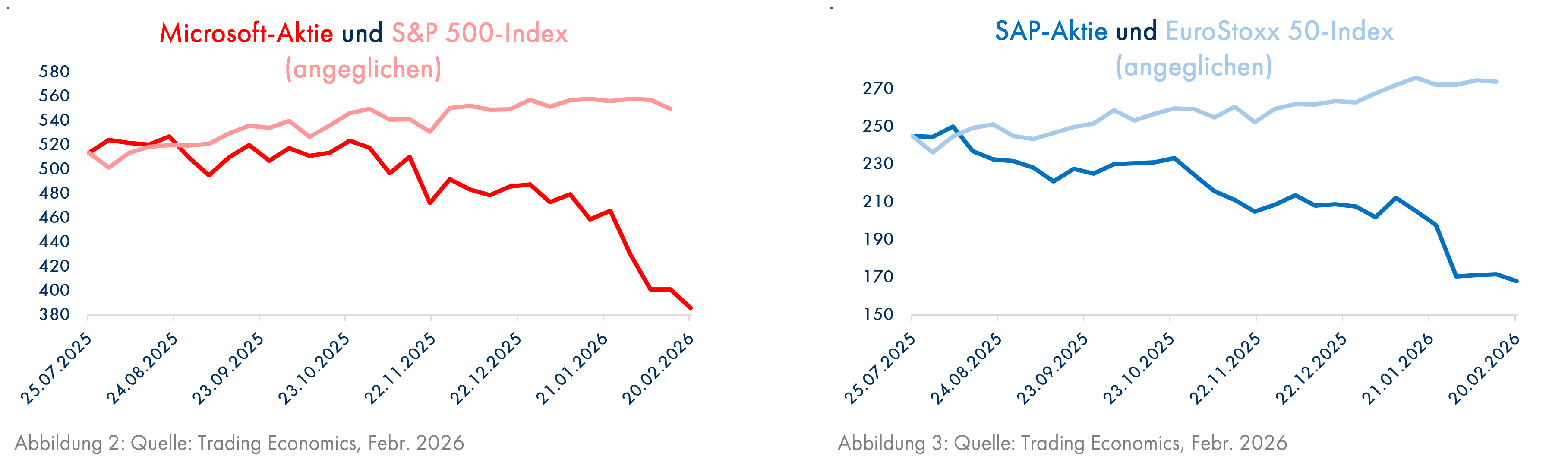 KI hat in wenigen Jahren nicht nur einem wesentlichen Teil der Schüler die lästige Aufgabe der Erstellung von Hausaufgaben abgenommen, sondern auch zahlreiche sinnvolle Anwendungen gefunden. Beispielsweise halten es manche Investoren für möglich, dass KI-Anwendungen komplexe Software ersetzen könnten, was bei den Software-Firmen - beispielsweise bei den jeweils größten Software-Aktien in den USA (Microsoft) und in Europa (SAP) - zu heftigen Kursrückgängen in ansonsten leicht steigenden Gesamtmärkten geführt hat (Grafiken 2 und 3).
