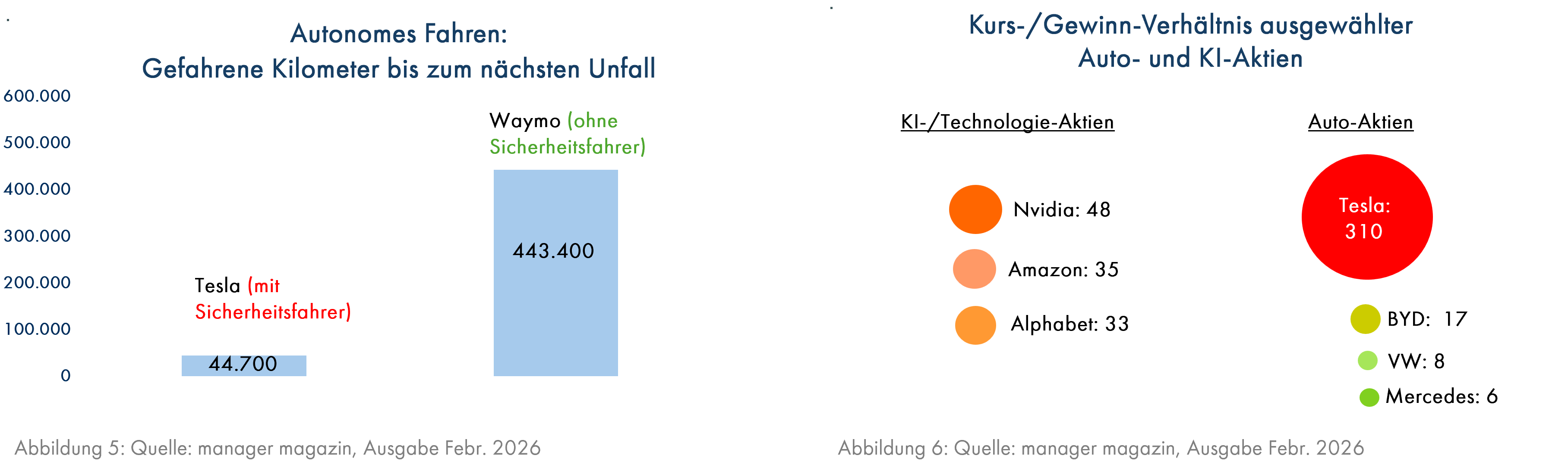 Die Technologieführerschaft hat Tesla bei autonom fahrenden Autos entgegen den seit Jahren geäußerten Ankündigungen bisher nicht geschafft (Grafik 5; die Alphabet-(Google)-Tochtergesellschaft Waymo ist technisch weit überlegen). Dennoch hat die Tesla-Aktie ihren quasireligiösen Status bisher nicht eingebüßt; die Bewertung übertrifft selbst diejenige der nicht gerade billigen großen Technologie- und KI-Firmen um beinahe das 10-fache, während andere Auto-Aktien nur mit einem winzigen Bruchteil des Tesla-Kurs-Gewinn-Verhältnisses ausgestattet sind (Grafik 6: die blasenförmige Darstellung der Unternehmensbewertung haben die Redakteure des manager magazins sicher ohne irgendeinen Hintergedanken gewählt).