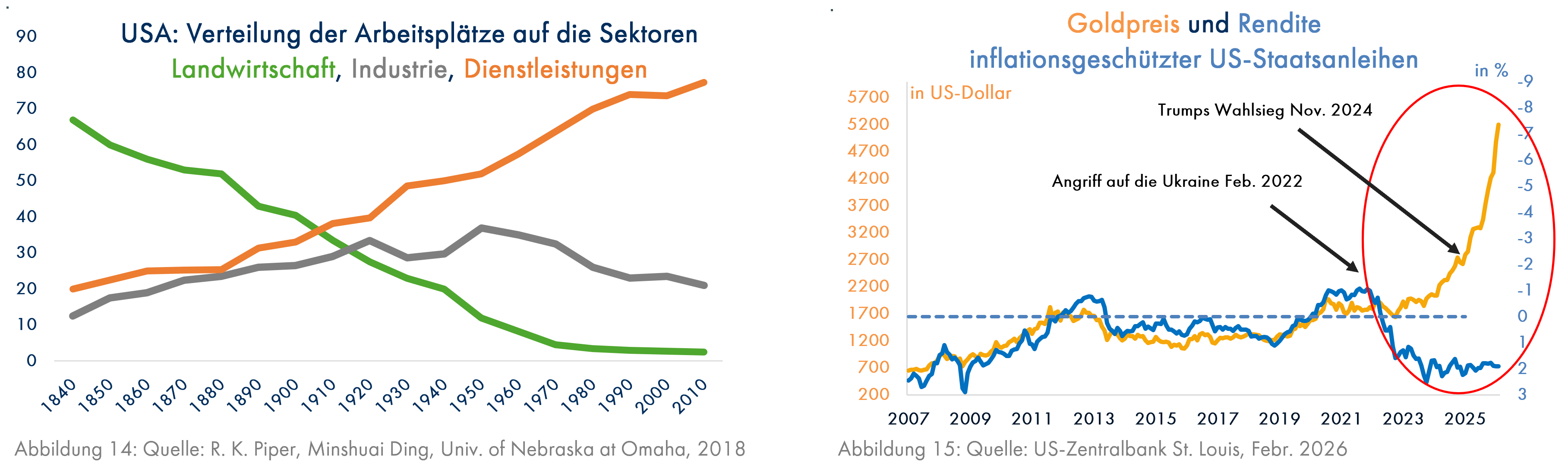 Allerdings traf diese Entwicklung auf eine moderne Wirtschaft, in der die in Landwirtschaft ab 1840 und in der Industrie ab 1950 freiwerdenden Arbeitskräfte im Dienstleistungssektor Verwendung fanden (Grafik 14). Dieser wird nun aber bei erfolgreichem Einsatz von KI ebenfalls Arbeitsplätze verlieren. Die Finanzprobleme der Regierungen, die ohnehin schon aufgrund der Alterung der Bevölkerung, bald aber möglicherweise auch aufgrund von Arbeitslosigkeit erheblich sind, werden weiter zunehmen. Insbesondere in den USA, wo die Staatsverschuldung wesentlich höher ist als in der Eurozone (siehe Grafik 24 im Kapitalmarktausblick vom September 2025, den Sie hier finden) und die Unternehmenssteuern besonders niedrig sind, besteht bei größeren Arbeitsplatzverlusten eine wachsende Wahrscheinlichkeit steigender Unternehmenssteuern, zumal der Oberste Gerichtshof der USA dem US-Präsidenten soeben sein Lieblingsspielzeug Zölle aus der Hand geschlagen und damit 175 Mrd. US-Dollar dringend benötigte Staateinnahmen entrissen hat. Seit Trumps Wahlsieg im November 2024 hat sich das Gold um 100% auf 5.200 US-Dollar verteuert; Grafik 15 zeigt, dass die Goldpreissteigerung seit 2022 nichts mehr mit der Inflation zu tun hatte. Bis zum Beginn des Ukraine-Krieges war der Zusammenhang zwischen dem Goldpreis und der umgekehrten Rendite inflationsgeschützter US-Staatsanleihen sehr eng, löste sich dann allmählich und nach Trumps Machtergreifung völlig auf. Mit den kriegsbedingten Aufrüstungskosten der westlichen Staaten und der irrlichternden Wirtschafts- und Außenpolitik von Trump wurde viel Vertrauen in die politische und finanzielle Stabilität der USA zerstört.