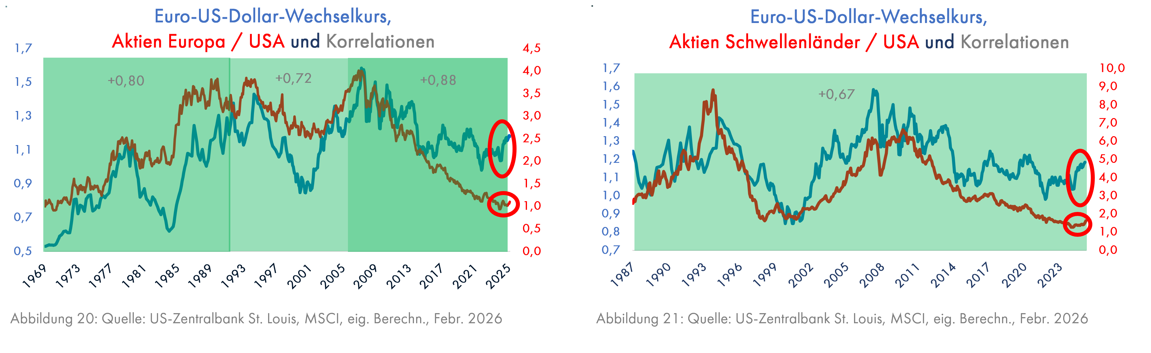 Ein fallender US-Dollar (steigende blaue Linie; man braucht mehr US-Dollar, um einen Euro kaufen zu können) geht seit 57 Jahren meistens mit einer steigenden roten Linie einher. Europäische Aktien performen dann besser als amerikanische (Grafik 20, ebenso verhält es sich mit den Schwellenländer-Aktien seit 1987, Grafik 21).