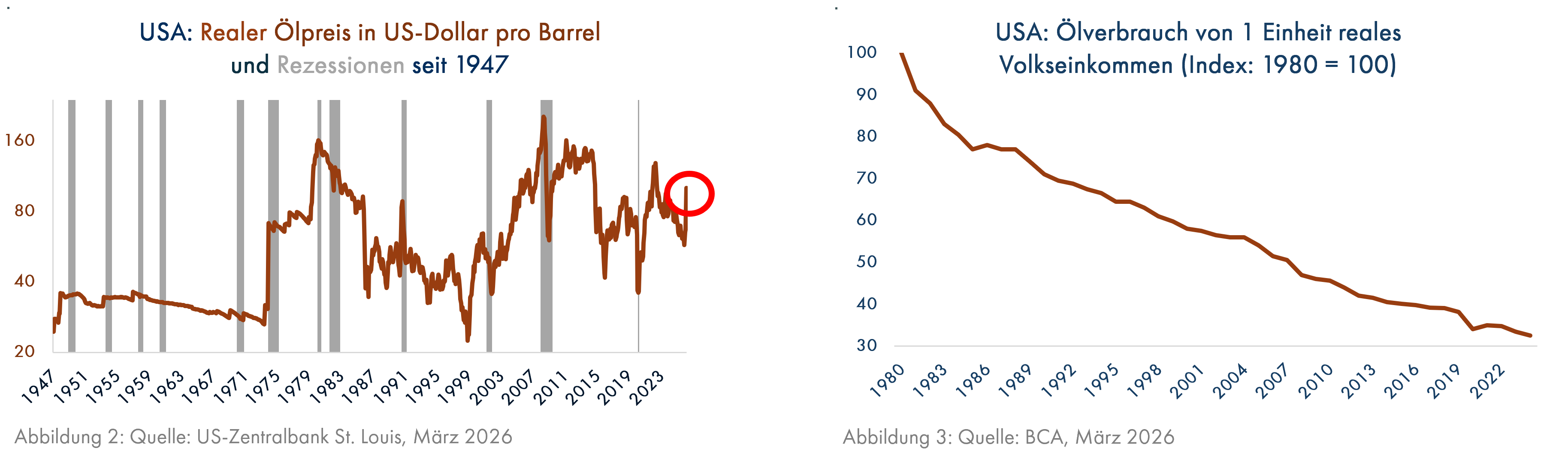 Der vom US-Präsidenten Trump mutwillig herbeigeführte Iran-Krieg scheint zunächst durch steigende Ölpreise die ölreichen USA weniger zu schädigen als andere Industrieländer. Allerdings hat Trump zu sehr auf seine persönlichen Vorteile (rechtzeitige Beteiligung an Drohnenherstellern, Ablenkung von den Epstein-Files, …) geachtet und die erheblichen Nebenwirkungen für die US-Wirtschaft übersehen. Diese bestehen aus stark verunsicherten Verbrauchern, schwächerer Konjunktur durch vorerst ausbleibende Zinssenkungen und fallende Aktienkurse, insbesondere im aufgeblähten Bereich der Künstlichen Intelligenz, was wiederum die Aktienbesitzer unter den Verbrauchern weiter verunsichert. Dazu kommt eine enorme Zinsbelastung der hochverschuldeten US-Regierung, die eine schwächere Konjunktur kaum noch unterstützen kann. Günstigere Aktienbewertungen, besser gelaunte Konsumenten und deutlich höhere Spielräume für höhere Staatsschulden könnten dazu führen, dass andere Länder besser aus diesem Konflikt herauskommen. Seine beiden wichtigsten Wahlversprechen, nämlich die Inflation sofort zu beenden und die USA künftig aus allen Kriegen herauszuhalten, hat Trump in der maximal möglichen Form gebrochen.