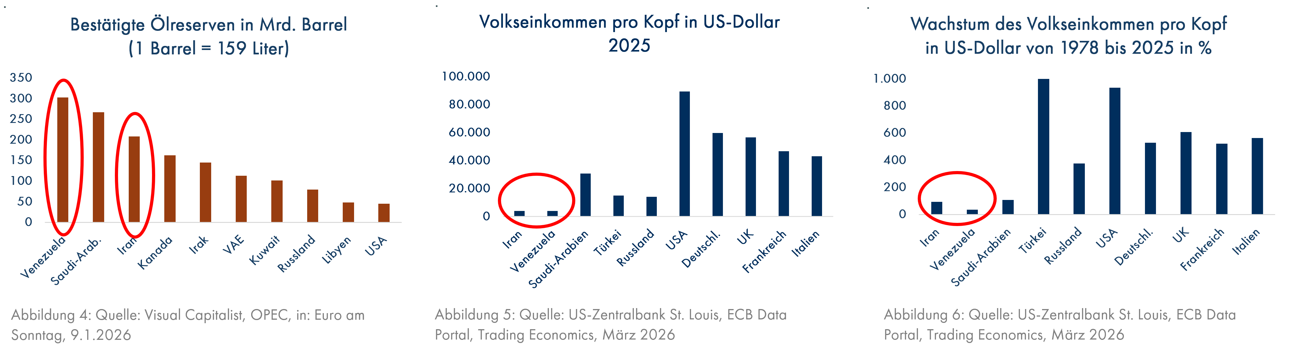 Die beiden von Trump in 2026 attackierten Länder Venezuela und Iran wurden seit 1978 extrem schlecht regiert. Obwohl sie bei den Ölreserven weltweit auf Platz 1 (Venezuela mit 303 Mrd. Barrel) bzw. Platz 3 (Iran mit 208,6 Mrd. Barrel) liegen (Grafik 4), ist das Volkseinkommen extrem niedrig (Grafik 5) und seit 1978 kaum gewachsen (Grafik 6).