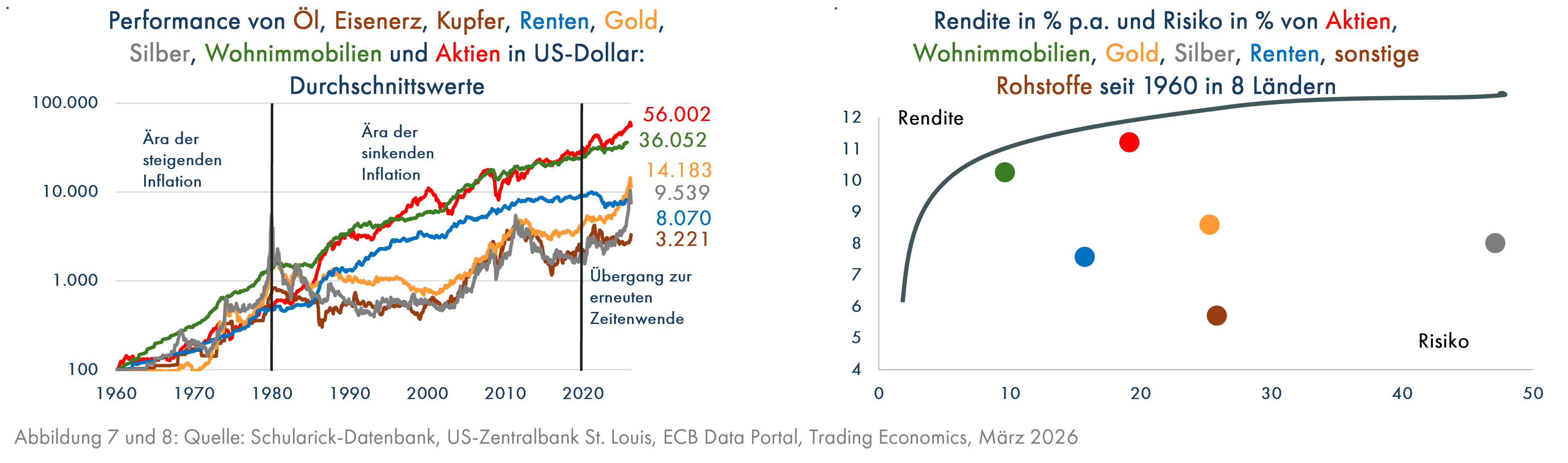 Laut OpenSecrets hat die Öl- und Gasindustrie insgesamt rund 250 Millionen US-Dollar für die Wahlen 2024 ausgegeben, wovon 88 % an republikanische Kandidaten flossen. Da kann man als vielbeschäftigter „Präsident“ schon mal das Detail übersehen, dass ein Krieg gegen den Iran die Spritpreise hochtreibt – auch in den ölreichen USA. Eine Spekulation auf steigende Ölpreise macht für langfristig orientierte Anleger jedoch wenig Sinn. Außer Gold sind die sonstigen Rohstoffe (hier: Öl, Kupfer, Eisenerz) und das hochriskante Silber allen anderen Anlageformen eindeutig unterlegen (Grafiken 7 und 8). Aus Grafik 2 kann man ablesen, dass der Ölpreis real, also nach Abzug der Inflation, seit 1980 in 46 Jahren keinen Preisanstieg geschafft hat.
