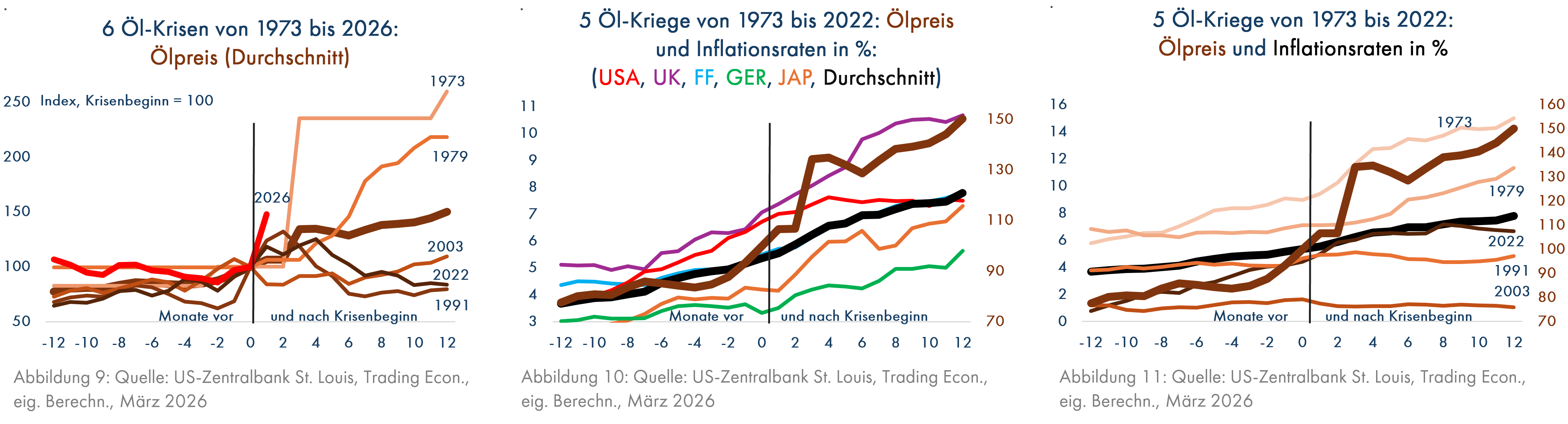 Nun wollen wir die Frage untersuchen, welche Auswirkungen die früheren 5 Öl-Kriege in 5 großen Industrieländern auf Ölpreis, Inflation, Zinsen und Aktienmärkte hatten. Der aktuelle Ölpreisanstieg seit dem Kriegsausbruch am 27. Februar 2026 erreicht bereits nach 4 Wochen den durchschnittlichen Preisanstieg der anderen 5 Kriege (Grafik 9). Nur 1973 und 1979 war ein deutlich stärkerer Preisanstieg als 2026 zu verzeichnen, allerdings erst nach einigen Monaten.