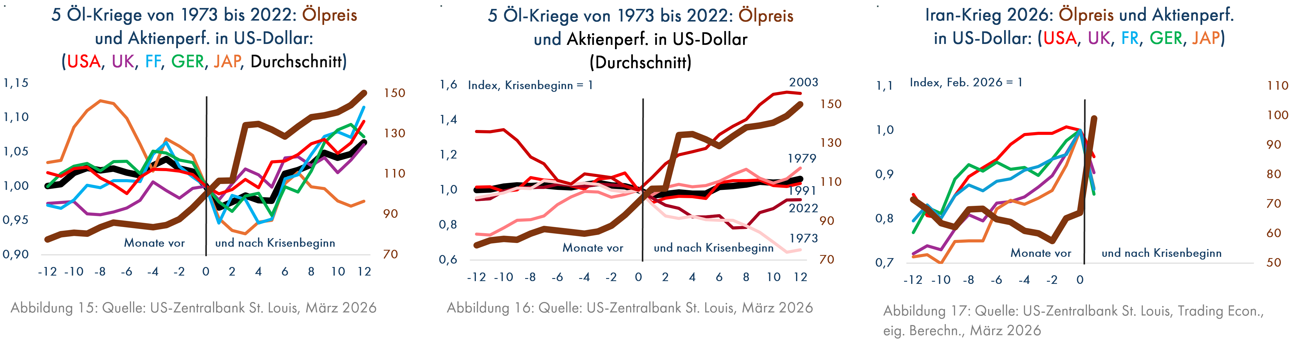 Auch an den Aktienmärkten verursacht ein Öl-Krieg nicht unbedingt hohe und nachhaltige Kursverluste. 12 Monate nach Kriegsbeginn blieb im Durchschnitt der 5 Kriege nur in Japan ein moderater Verlust von -2,2% übrig, in den anderen 4 Ländern lag die Performance zwischen +6% und +11,5% (Grafik 15).