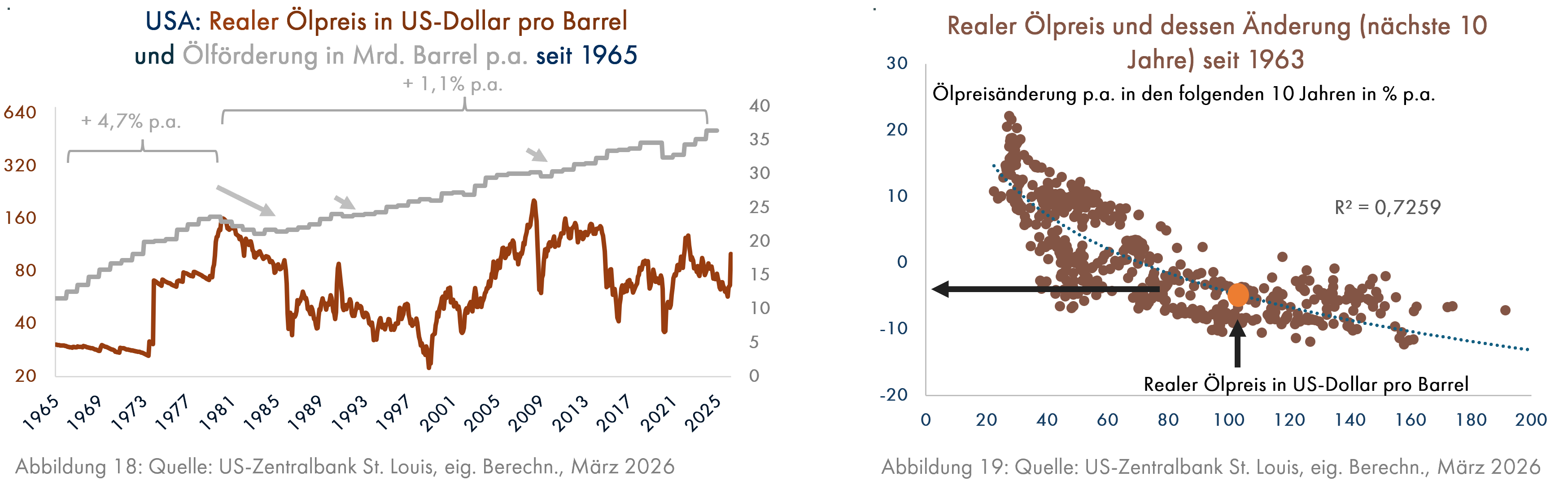 Nur wenn es einen langfristig massiven Anstieg des Ölpreises gäbe, wären schwere Verwerfungen an den Kapitalmärkten zu erwarten. Ein hoher Ölpreis wird jedoch immer eine verringerte Nachfrage und damit auch künftig einen Preisverfall erzeugen. Grafik 18 zeigt die Nachfragerückgänge insbesondere nach den beiden Ölkrisen 1973 und 1979, die einen massiven Anstieg des Ölpreises und dann einen jahrelangen Nachfragerückgang bewirkt hatten. Real ist der Ölpreis seitdem nicht mehr gestiegen, und die Nachfrage wächst seit 1980 jährlich nur noch um 1,1%, während davor + 4,7% p.a. erreicht wurden. Unser Prognosemodell erwartet bei einem Ölpreis von aktuell 100 US-Dollar ca. 4% jährlichen Preisverfall bis 2036 (Grafik 19). Die Ursache für diese schwachen Preisentwicklungen liegt in dem Grundproblem der Rohstoffspekulation. Wird ein Rohstoff zu teuer, sucht man neue Fundstellen und/oder einen billigeren Ersatz. Die menschliche Geschichte zeigt, dass dies meistens gelang. Die Steinzeit ging nicht wegen des Mangels an Steinen und die Bronzezeit nicht wegen des Mangels an Bronze zu Ende, sondern weil Bronzebeile oder -dolche erhebliche Vorteile gegenüber denselben Produkten aus Feuerstein hatten. Später verdrängte Eisen die Bronze, weil es viel billiger war. Auch das Ölzeitalter wird nicht wegen des Mangels an Öl enden. Mit den verschiedenen Formen von erneuerbaren Energien, Atomkraft und vielleicht Kernfusion sind die Nachfolger bereits vorhanden. Aus diesen Gründen genügt seit 63 Jahren für unser Prognosemodell ein hoher Ölpreis für die Prognose eines langfristig fallenden Ölpreises (Grafik 19).