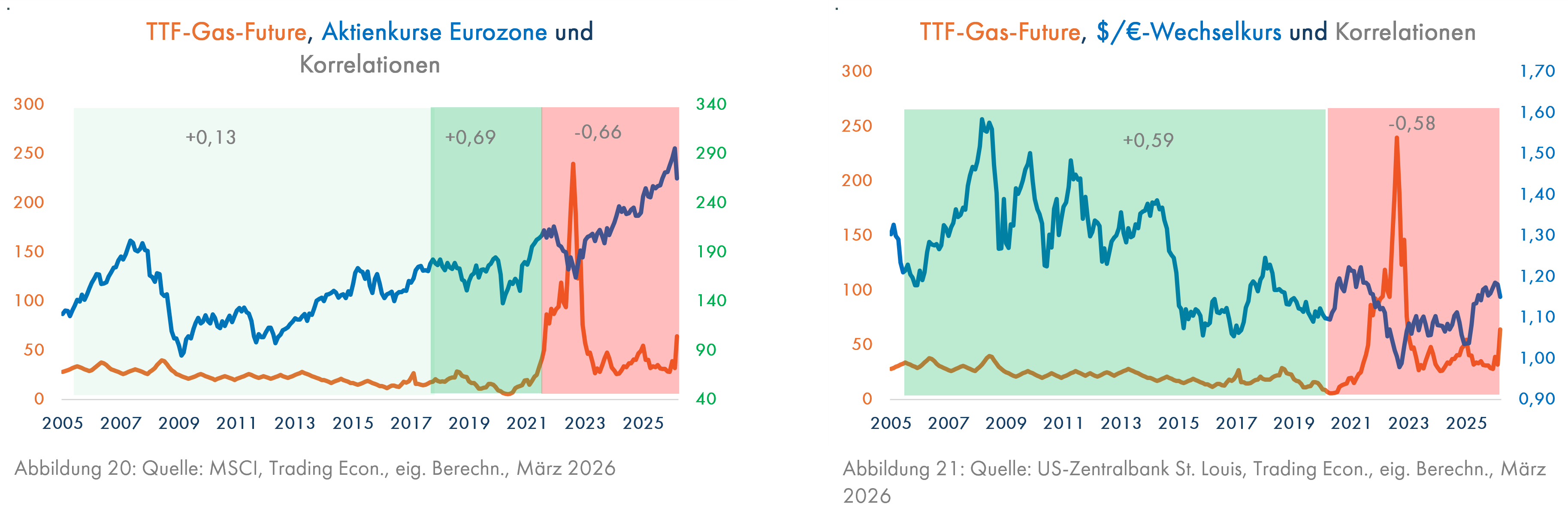 Das heißt allerdings nicht, dass es in den nächsten Monaten keine weiteren Risiken für die Kapitalmärkte gibt. Neben dem Ölpreis ist seit Kriegsbeginn auch der für Europa wichtige Gaspreis kräftig gestiegen. Als dieser ab Mitte 2021 deutlich anstieg, begann der europäische Aktienmarkt darauf negativ zu reagieren (rotes Feld in Grafik 20), während in den Jahren zuvor kein negativer Einfluss des Gaspreises auf die Aktienkurse gegeben war. Dagegen begann der US-Dollar zu dieser Zeit, von steigenden Gaspreisen zu profitieren (blaue Linie in Grafik 21 fällt dann; man braucht weniger US-Dollar für dem Kauf eines Euro). Beides zusammen hat die europäischen Aktienkurse seit Kriegsbeginn etwas stärker fallen lassen als die amerikanischen.
