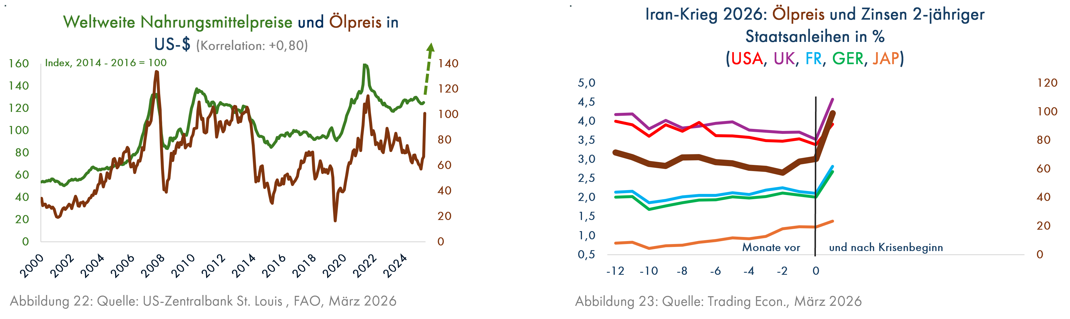 Neben dem Gas werden auch viele andere Produkte teurer, z.B. Nahrungsmittel (Transportkosten und Düngemittelpreise hängen vom Ölpreis ab, Grafik 22), aber auch chemische Erzeugnisse, Stahl und vieles mehr. Damit sind alle Hoffnungen auf Zinssenkungen der Zentralbanken vorerst gegenstandslos; die den Geldmarktzinsen vorauslaufenden Renditen der kurzfristigen (2-jährigen) Staatsanleihen sind in den letzten 4 Wochen kräftig gestiegen (Grafik 23), was dem bisher von Zinssenkungen erhofften Konjunkturaufschwung schaden wird.