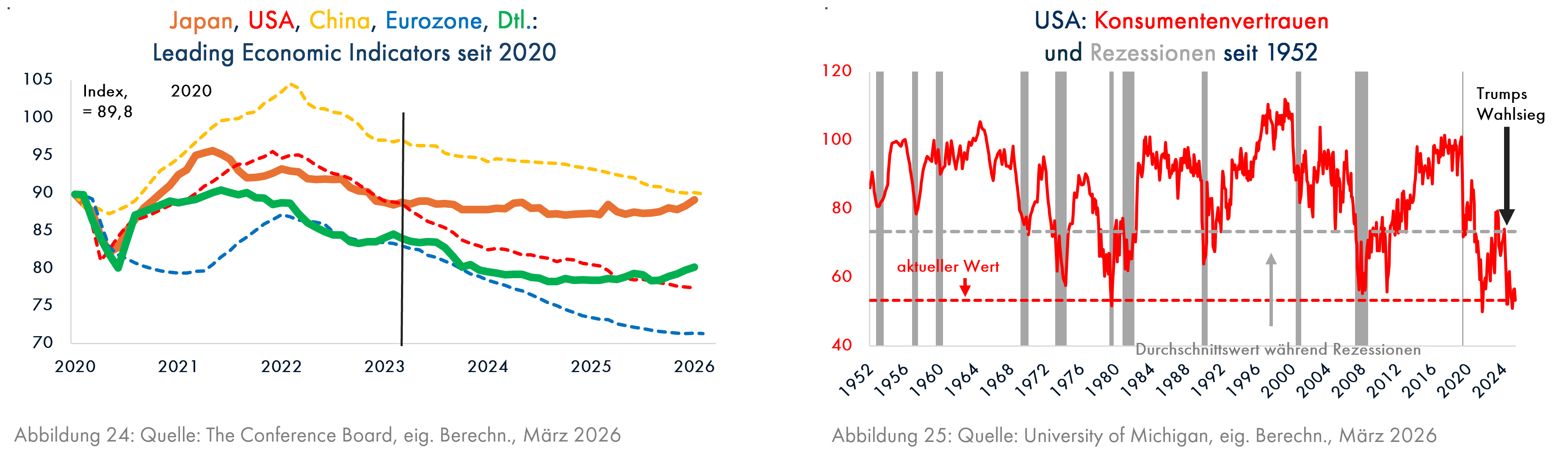 Ohnehin waren die Konjunkturaussichten in den großen Regionen der Welt (USA, China, Eurozone) nicht sehr rosig; seit 2022 fallen dort die wirtschaftlichen Frühindikatoren, wobei allerdings die bisher schwachen Länder Deutschland und Japan schon seit 3 Jahren eine stabile und zuletzt sogar eine steigende Tendenz der Frühindikatoren zeigen (Grafik 24). Einer der Gründe für die schwache Tendenz in den USA ist das schon seit der Inflationswelle, die durch die Corona-Krise und den Ukraine-Krieg ausgelöst worden war, schwache Konsumentenvertrauen, das nach Trumps Wahlsieg wieder auf extrem niedrige Werte gefallen ist (Grafik 25). Allmählich merken auch einige Trump-Wähler, dass dieser „Präsident“ seine beiden Wahlversprechen, die Inflation sofort auf Null zu senken und Amerika künftig aus allen Kriegen herauszuhalten, massiv gebrochen oder vielleicht auch einfach vergessen hat, aber sich eifrig der Selbstbereicherung widmet. 8 Mio. Amerikaner haben am letzten März-Wochenende gegen Trump demonstriert.