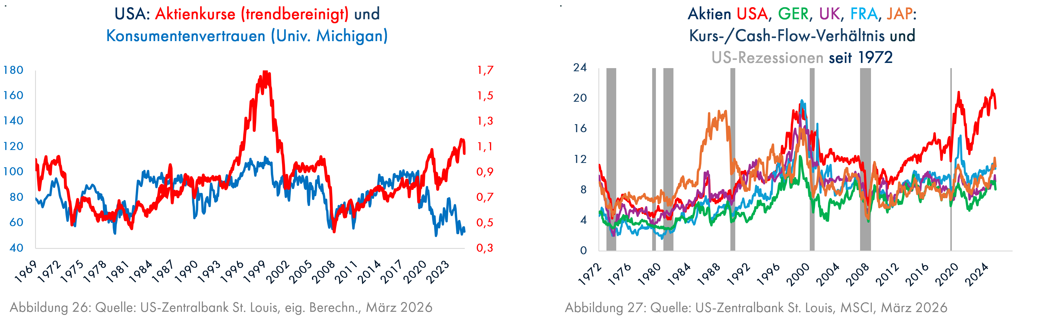 Die Konsumbereitschaft der Amerikaner könnte noch aus einem anderen Grund künftig belastet werden. Der US-Aktienmarkt wurde seit 15 Jahren durch die im internationalen Vergleich auffallend schnell wachsende Staatsverschuldung (siehe den Kapitalmarktausblick vom September 2025, den Sie hier finden) und insbesondere seit 2022 durch die Euphorie zum Thema Künstliche Intelligenz (KI) auf eine extrem hohe Bewertung getrieben (siehe dazu ausführlich den Kapitalmarktausblick vom Oktober 2025, den Sie hier finden). Das Konsumentenvertrauen verlief normalerweise parallel zum trendbereinigten Verlauf des Aktienmarktes, weil höhere Aktienkurse die Aktiendepots wertvoller machten, so dass man sich reicher fühlte, und umgekehrt; hier hat sich aber in den letzten Jahren eine ungewöhnlich ausgeprägte gegenläufige Tendenz herausgebildet (Grafik 26). Nun hat Trump mit dem Iran-Krieg dafür gesorgt, dass das Verbrauchervertrauen und die Aktienkurse wegen höherer Inflation und Zinsen gleichzeitig fallen. Ähnlich wie bei der noch immer sehr hohen Aktienbewertung (Grafik 27) hat auch die Kluft zwischen den Aktienkursen und dem Verbrauchervertrauen noch viel Luft nach unten. Zu allem Überfluss wackelt jetzt auch das Thema KI; die dazugehörigen Aktien sind in den letzten Monaten bereits um 20% und damit deutlich mehr als der gesamte Aktienmarkt gefallen (Grafik 28). Bereits im Februar wurden die ersten kreditfinanzierten Aktiendepots verkauft. Deren rekordhohe Volumina (Grafik 29) dürften im März erneut gefallen sein und den Markt auch künftig durch Zwangsverkäufe belasten.