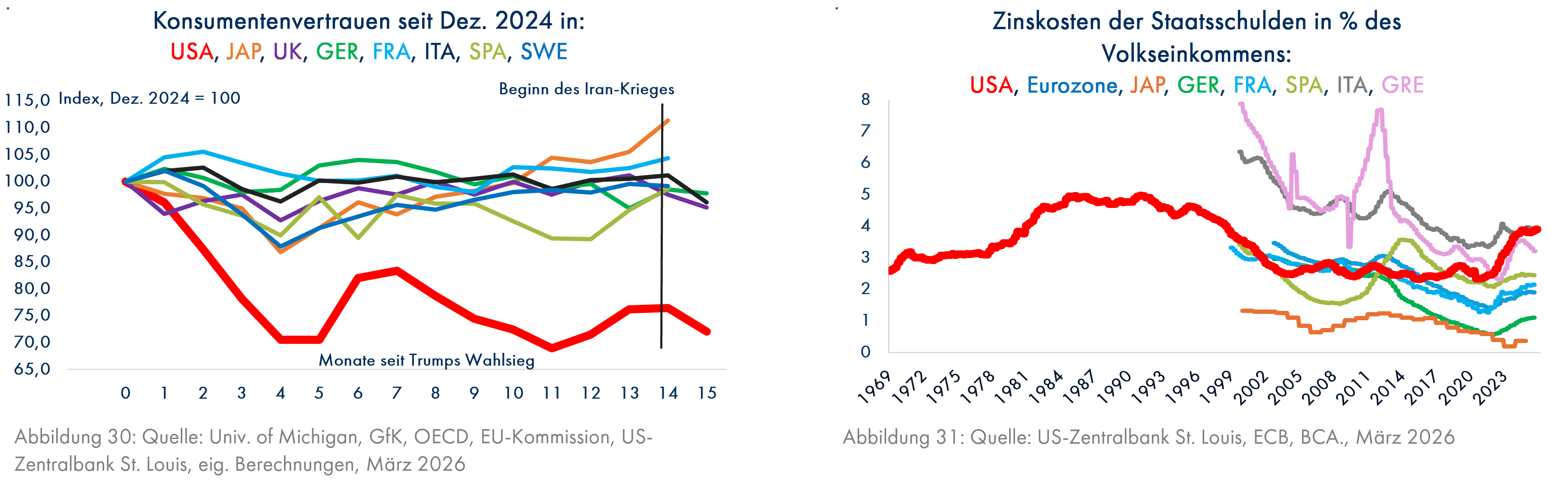Andere große Länder werden deutlich weniger Probleme haben. Die Aktienbewertung ist deutlich niedriger (Grafik 27), es gibt weniger KI-Aktien als in den USA und das Konsumentenvertrauen ist stabiler (Grafik 30). Auch die aufgeblähte Staatsverschuldung, zu der Trump schon während seiner ersten Präsidentschaft erhebliche Beiträge geleistet hatte, könnte ihm jetzt auf die Füße fallen. Die Zinskosten der US-Regierung liegen inzwischen mit 3,9% des Volkseinkommens exakt auf dem italienischen und deutlich über dem griechischen Niveau (3,2%, Grafik 31), aber auch über den Verteidigungsausgaben der USA. Falls die Konjunktur nun auch aufgrund des sinnlosen Krieges kippt, kann die US-Regierung kaum noch gegensteuern, ohne die Bonität der Staatsanleihen weiter zu gefährden. Da haben insbesondere Japan und Deutschland, aber auch andere europäische Länder eine bessere Ausgangslage.