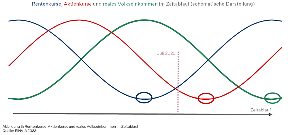 Wir befinden uns daher bereits im für Aktien besonders interessanten Bereich des Konjunkturzyklus (siehe Grafik 3). Schon die ersten Zinserhöhungen der Zentralbanken haben ausgereicht, um Ängste vor einer Rezession auszulösen, auch in den USA (siehe Grafik 2), die nicht das Energieproblem einiger europäischer Länder haben. Daher haben etliche Anleger seit Mitte Juni begonnen, „sichere“ Staatsanleihen zu kaufen, obwohl das Zinsniveau überall noch weit unter der aktuellen Inflationsrate liegt. Dementsprechend beginnen die Rentenkurse bereits zu steigen, in der Eurozone auch deswegen, weil die EZB schon bei einem Zinsniveau von etwas über 4 % für Staatsanleihen Italiens dessen finanzielle Stabilität gefährdet sieht und über erneute Anleihekäufe nachzudenken begonnen hat.