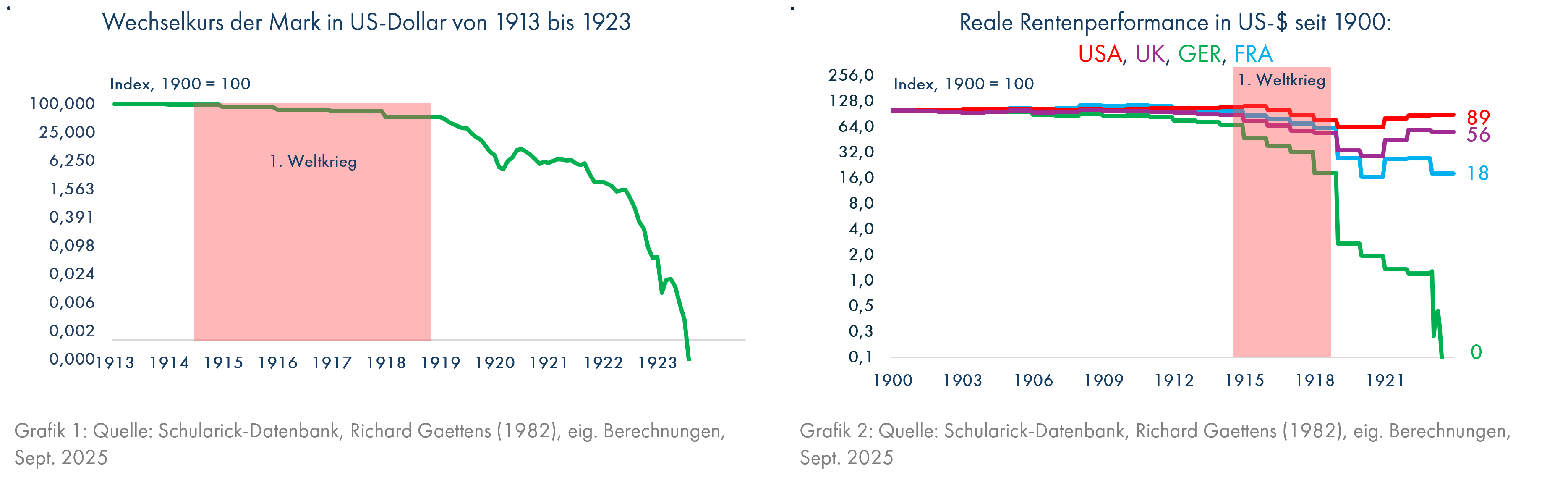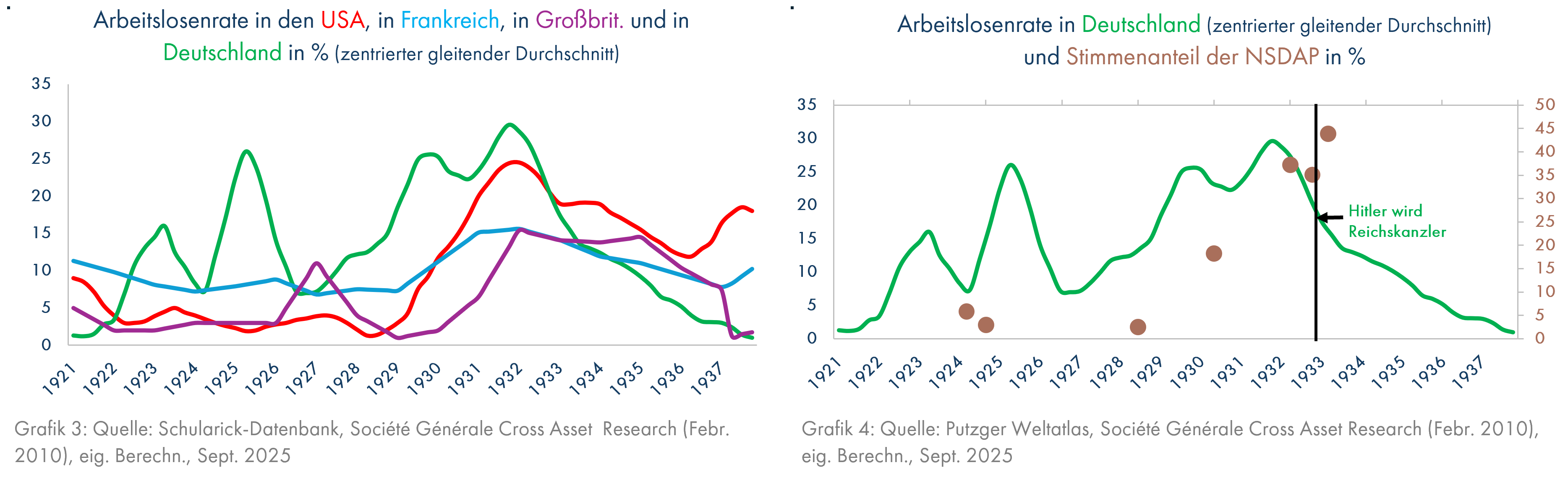 Die deutschen Sparer hatten Ende 1923 ihr gesamtes Geldvermögen verloren (Grafik 2, der Totalausfall der Staatsanleihen fand ebenso bei den Spareinlagen statt). Auch in anderen Ländern gab es deutliche reale Wertrückgänge von Anlagen in Staatsanleihen oder Geldmarktanlagen, aber diese fielen weitaus weniger dramatisch aus als in Deutschland. Da nun sehr viele Deutsche völlig verarmt waren, daher als Konsumenten weitgehend ausfielen und die Unternehmen hohe Kosten bei der Umstellung der Kriegsproduktion auf im Frieden nachgefragte Güter zu tragen hatten, war die Arbeitslosigkeit in Deutschland ab 1924 wesentlich höher als in den anderen großen Kriegsteilnehmerländern USA, Großbritannien und Frankreich (Grafik 3).