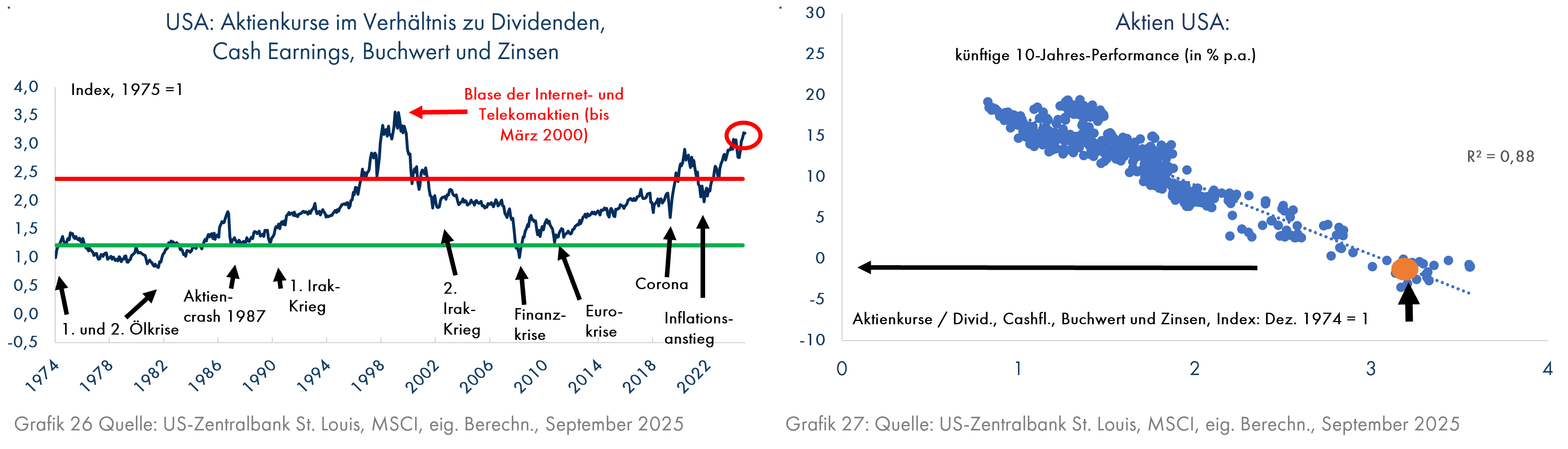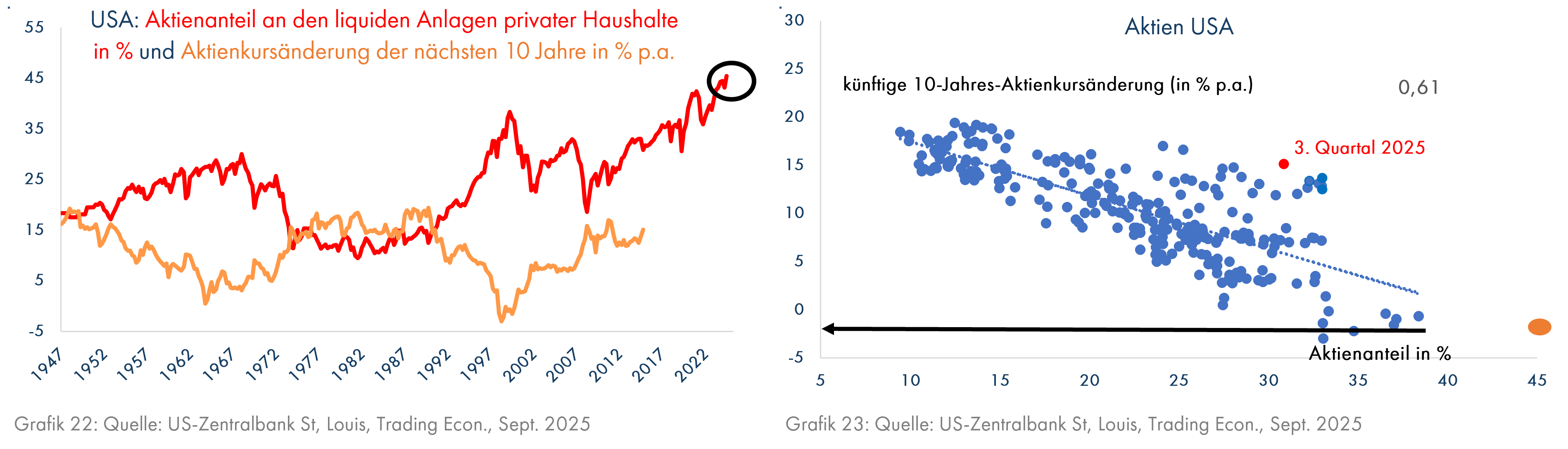 Die Zahl der weiteren Warnsignale nimmt zu. Seit 1947 war der Aktienbesitz im Vermögen der Privaten Haushalte außer im Jahr 2025 nur im Jahr 2021 genauso hoch wie der Besitz von Wohnimmobilien (Grafik 19). Daraus lässt sich seit 1963 ein recht gutes Prognosemodell für die relative Performance von US-Aktien zu US-Wohnimmobilien erstellen (Grafik 20). Das ernüchternde Resultat lautet: In den nächsten 10 Jahren werden Aktien um 8%-Punkte p.a. schlechter als Wohnimmobilien abschneiden. Aber auch für diese sind die Aussichten nicht besonders rosig (Grafik 21); das Prognosemodell, das genauso aufgebaut ist wie das Modell für deutsche Wohnimmobilien (siehe Kapitalmarktausblick vom Juli 2025, den Sie hier finden), erwartet keine Wertsteigerungen von US-Wohnimmobilien.