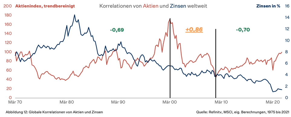 Zwischen 1999 und dem Frühjahr 2009 war die Korrelation jedoch mit +0,86 stark positiv – wenn die Zinsen fielen, fielen auch die Aktienkurse, was ökonomisch eigentlich unsinnig ist. Man hatte jedoch nach der Beinahe-Pleite Russlands im Herbst 1998 und dem dadurch verursachten Konkurs des 125 Mrd. US-$ schweren Hedgefonds LTCM (geleitet von zwei Wirtschafts-Nobelpreisträgern) grundsätzliche Ängste, ob eine starke Deflation wie 1929 bis 1933 aufgrund einer allgemeinen Pleitewelle (Dow-Jones-Aktienindex damals minus 89%) nicht mehr auszuschließen wäre. Daher flüchteten in den folgenden 10 Jahren viele Anleger bei fallenden Aktienkursen sofort in „sichere“ Staatsanleihen, so dass deren Kurse stiegen und die Zinsen ebenfalls fielen. In dieser Zeit war die Korrelation von Aktien und Zinsen positiv. Knapp 10 Jahre später hatte die US-Zentralbank nach der Lehman-Pleite im September 2008 jedoch gezeigt, dass sie sich durch Gelddrucken im großen Stil jeder Deflation oder Pleitewelle konsequent entgegenstellen würde. So wurde das Vertrauen in die grundsätzliche Stabilität des Finanzsystems und damit auch der Aktienmärkte wiederhergestellt. Diese reagieren seitdem auf Zinssenkungen wieder normal – mit der kleinen Ausnahme des Corona-Crashs im März 2020.