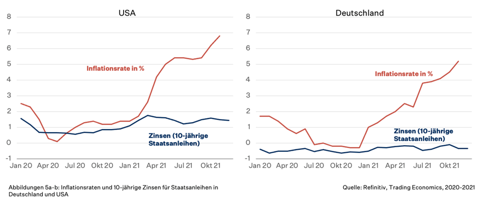 Angesichts der künftig weiter wachsenden Belastungen der Staatshaushalte durch die Alterung der Bevölkerung und die notwendige Bekämpfung des Klimawandels ist ein Absinken des Schuldenniveaus wie nach 1945 völlig undenkbar. Die Niedrigzinsen dürften uns noch viele Jahre erhalten bleiben. Da dieser Zusammenhang vielen Großanlegern (und auch den Zentralbanken, daher die beschwichtigenden Kommentare der EZB) zunehmend bewusst wird, haben die langfristigen Zinsen auf den Inflationsanstieg bisher kaum reagiert (Abbildungen 5a-b).