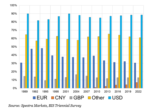 Die alle drei Jahre von der Bank für Internationalen Zahlungsausgleich durchgeführten Erhebungen über die Devisenmärkte bestätigen, dass der Dollar zwar etwas an Marktanteilen verliert, aber immer noch einen großen Vorsprung im Vergleich zur Konkurrenz hat. Selbst das britische Pfund ist immer noch an mehr Transaktionen beteiligt als der chinesische Yuan.